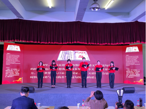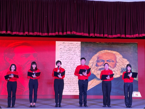 分团委书记刘迪老师精心设计导演下,大学英语部陆朋、日文系张慧霞、俄文系乐音、德文系张申威、法文系姜俊钦和西班牙语系秦剑等6位老师用中外7种语言精彩演绎了《共产党宣言》这一闪耀着真理光芒的红色经典。大屏幕中,一幅幅珍贵的照片和生动的语言回顾了“宣言”从诞生到在中国广泛传播的全过程。伴随着激昂的国际歌,老师们用世界语言交替喊出“全世界无产者联合起来”的口号,将演出推向高潮。整个节目凸显学科特色、彰显时代风采、展现经典魅力、传承红色基因,得到了评委的高度评价,收获了观众们的肯定和赞扬。最终,在全部参赛的28个二级工会中,52书库