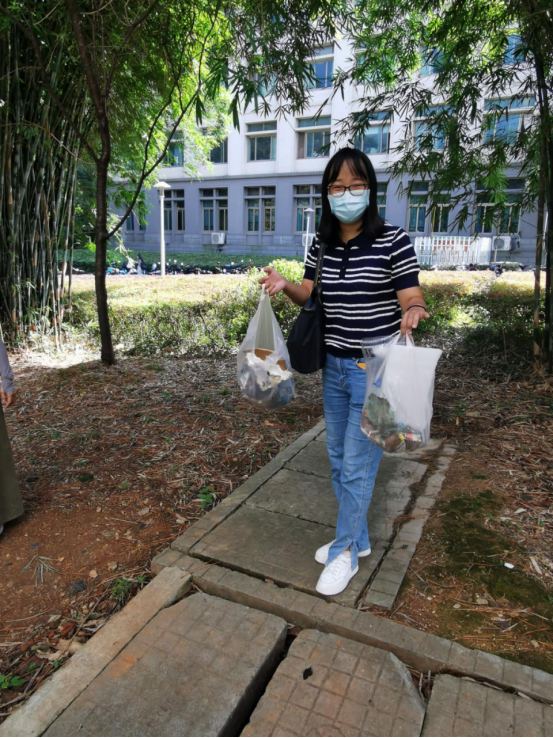 最后,大家对外院大楼左手的竹林进行了集中清理。发现了旧雨伞、烟头、烟盒、打火机、食品袋、饮料盒、圆珠笔、纸张等物品。路遇法语系程平老师,友情协助摄影,特表感谢!