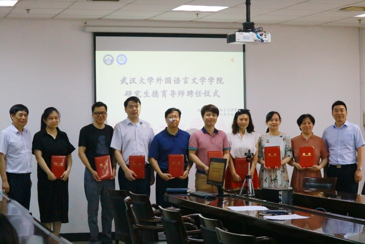 研究生办公室主任周新元宣读聘任文件。为落实学院“三全育人”综合改革实施方案,切实加强研究生导师队伍建设,进一步改进研究生思想政治工作,结合学院研究生工作实际情况,学院党委研究决定,在英语语言文学、法语语言文学、日语语言文学、俄语语言文学、德语语言文学、外国语言学及应用语言学、翻译学和MTI等8个研究生学位点聘任9位研究生德育导师。具体名单如下:黄忠、李丹丽、苏昉、李圣杰、田园、徐琼星、赵玲、黄敏、胡玲。