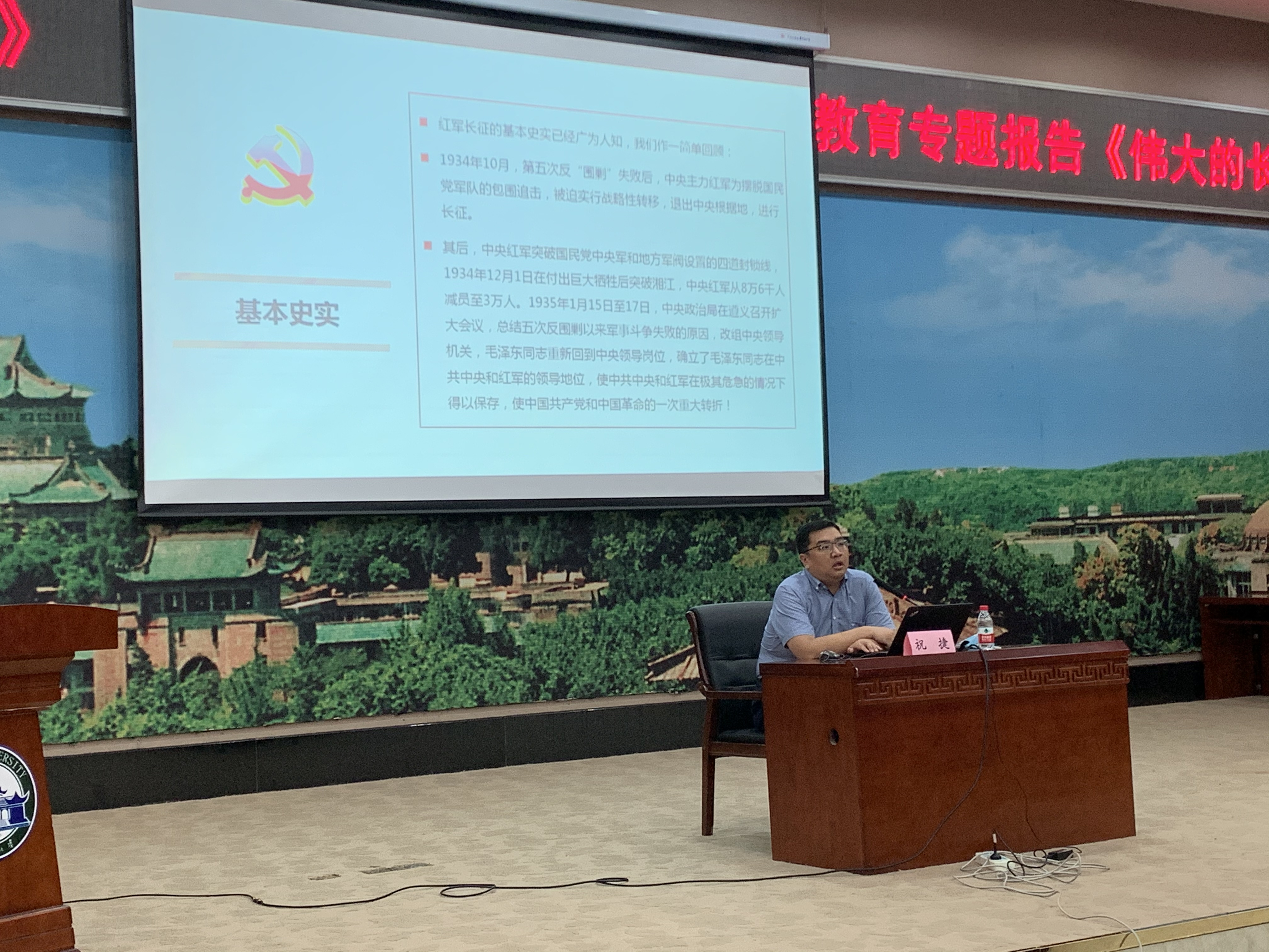 全体党员师生讲授党课。课上,祝捷教授结合长征的基本史实论述了毛泽东同志领袖地位的形成过程和共产党人的初心使命,指出长征即独立自主探索中国革命道路的开始,阐释了长征精神及其伟大意义,激励外院青年增强使命担当,走好新时代的长征路。