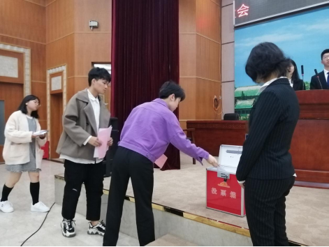 学生代表们庄重地填写选票,并在工作人员的指引下投入票箱。