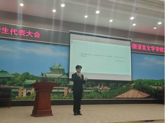 黄宏发老师向同学们致以亲切的问候,肯定了外院学生会在过去一年中取得的“优秀学风建设集体”“十大杰出志愿服务集体”“阳光体育先进集体”等成绩。黄老师指出,2020是极不平凡的一年,外院学生会坚守岗位,克服困难,鼓舞了全院师生抗击疫情的信心,并主持全校英语学习打卡活动,让学生们真切地感受到在家如在“珈”,切实把学生会打造成了保护学生合法权益、促进共同发展的重要平台。