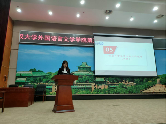 第三十届学生会主席彭博作学生会工作报告。首先,彭博同学总结了过去一年中外院学生会的工作成就:深化组织改革,狠抓内部建设,以全校第一名的优异成绩获得52书库