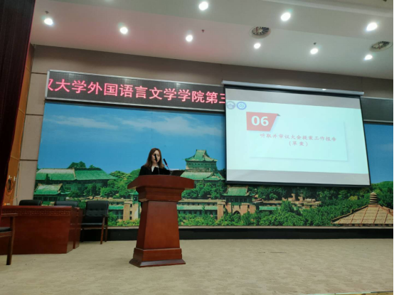 “优秀骨培分校”荣誉称号;创新思政活动,加强思想引领时效,弘扬青春正能量,于线上成功举办“传播战疫故事,明确青年担当”等活动;重视学风建设,营造“崇学”“尚学”氛围;坚持志愿先行,创新青年服务形式;重视实践活动,凝聚外院力量;文艺体育并重,丰富校园文化活动,为外院学子营造了良好体育氛围;重视维权服务,倾听学生声音;立足新媒体阵地,畅通宣传渠道。随后,她对新一届学生会提出几点希望:第一,坚守工作初心,淡化功利心,少说空话,多做实事;第二,进一步建立健全学生会工作人员评价考核制度,规范学生会成员的工作态度和作风;第三,增强服务意识,牢记服务宗旨,把外院学生会建设成同学们想得起,找得到,靠得住的温暖家园;第四,开拓学生工作新思路,提升工作水平。