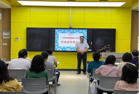 首先,游长松副院长代表学院向老师们致以节日祝贺。随后,游院长介绍了学院举办“信息技术培训会”的目的,强调将信息技术引入外语课堂的必要性和重要性,要求老师们要与时俱进,学习和掌握最新的教学理念和教学手段,用好智慧教室,提升教学质量。