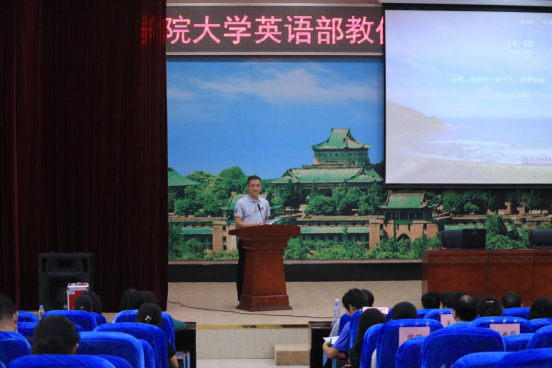 院长马萧,副院长游长松、贾玉敏,党委副书记、工会主席胡浩,工会副主席王敏、何发兵及大学英语部教代会正式代表出席会议。此外,还专门邀请了大学英语部除教代会代表之外的其余全体教师参加了会议。
