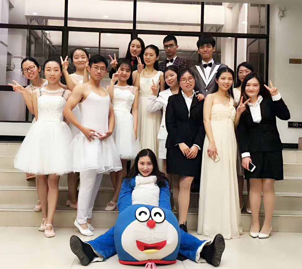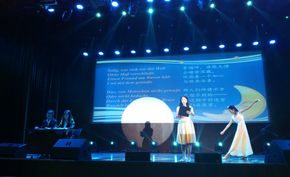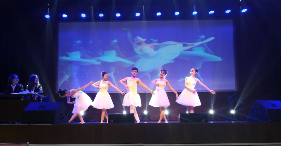 节目《珞珈山环球资讯》,以新闻播报的方式在展现语言学科特色的同时尽显外院研究生学子风采。第一则热点新闻是一场希拉里和特朗普的辩论,突出了英语语言特色;第二个新闻展示的是法语歌曲《La Vien en Rose》,情歌浪漫对唱,并伴有两位新闻主播人在一旁沉醉其中的表情包;第三个节目属于俄语板块,芭蕾舞蹈表演《小天鹅》,四只美丽的天鹅翩翩起舞,最精彩则属一只“雄天鹅”的优美舞姿,带来了活泼可爱风;第四个节目为德语朗诵,纯正而富含诗意的朗诵在宁静的背景音乐中显得尤为好听,一旁的舞者体态轻盈姿态优雅,更添诗意;最后一个上场的是可爱的哆啦A梦,任意门开启,欢快的节奏响起,所有演员上台一起嗨,点燃全场。