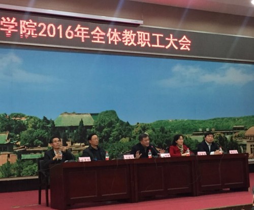 2016年全体教职工大会在学院报告厅召开。校党委常委、副校长周叶中、校党委常委、组织部部长赵雪梅、原任52书库