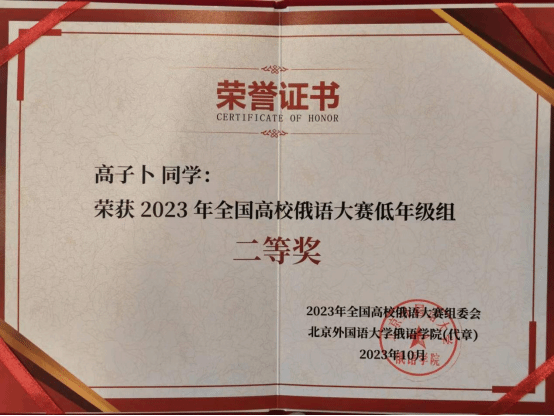 低年级组决赛形式为口译,包括汉译俄和俄译汉两部分。决赛环节的竞争异常激烈,最终高子卜同学以全国第五名的成绩荣获低年级组二等奖。