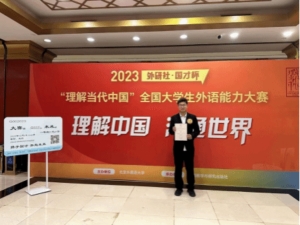 李胜泽同学在历时三个月的校赛、省赛和国赛第一轮中表现出众,是湖北省唯一进入国赛决赛的法语组选手。比赛分为口译、即兴演讲和回答问题两部分。口译包含视译题和听译题各1道,考察选手对主题的把握以及口译策略的灵活运用,引导选手掌握中国话语和叙事体系,对外讲好中国故事、传播好中国声音。即兴演讲包含演讲与回答问题,考察选手们的综合语言能力、表达能力和即时信息处理能力。李胜泽同学与20名实力超群的选手同台竞技,凭借过硬的外语综合运用能力、表达能力和思辨能力,最终取得综合排名第八名并荣获国赛银奖。