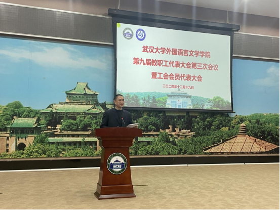 院党委书记黄宏发作总结发言。他代表学院党委对大会的召开表示热烈祝贺,对全院教职工的辛苦付出致以诚挚谢意。黄书记指出,2024年学院各项工作取得了一定的成绩,这些成绩的取得,得益于习近平总书记和党中央的坚强领导,得益于学校党委的支持和指导,更得益于全院师生同舟共济,团结一心。希望在2025年,全体教职工和各位工会会员能够尽职尽责,增强政治意识、责任意识、大局意识和团结协作意识,共同为学院的发展贡献力量。