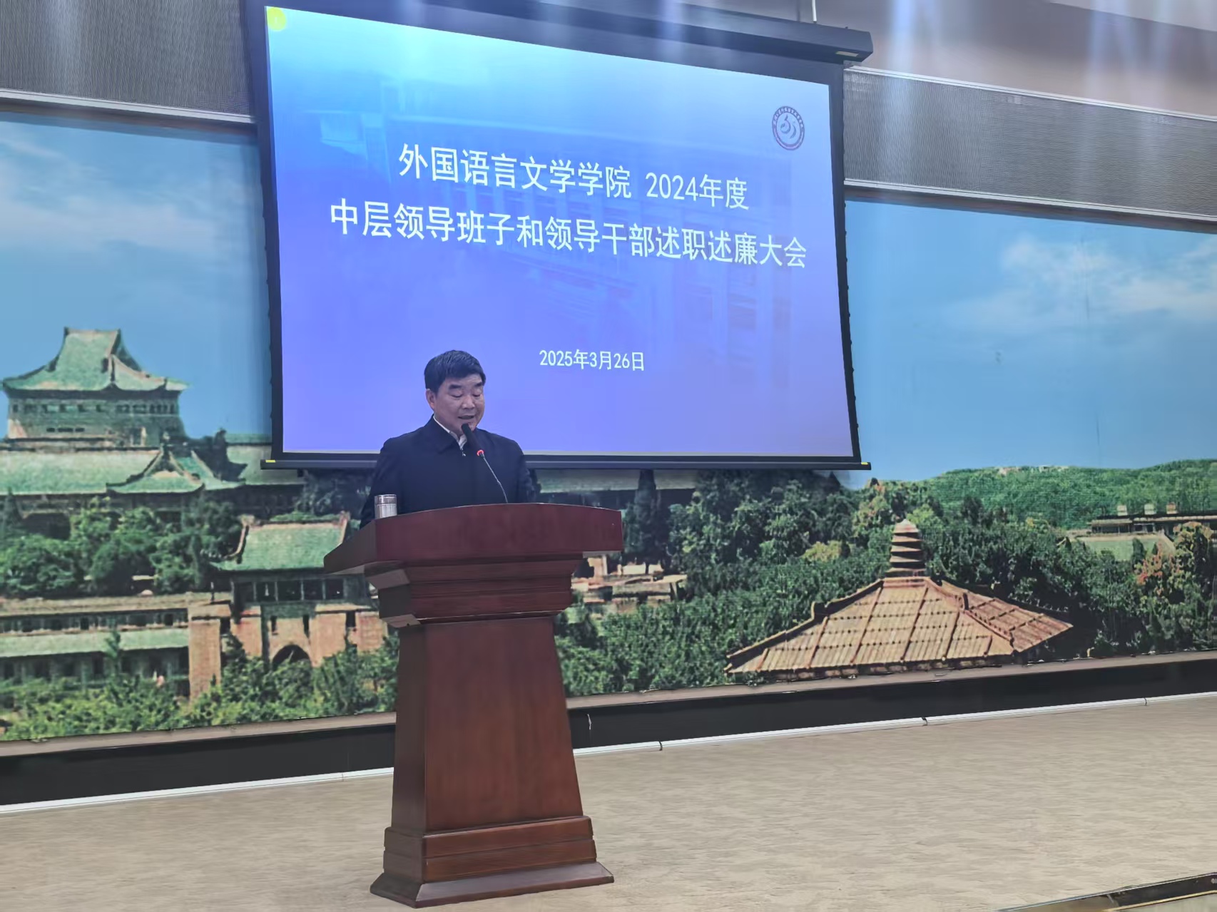 2024年度中层领导班子和领导干部考核述职述廉大会于学院一楼报告厅召开,党委书记黄宏发主持大会,全体教职工参加大会。