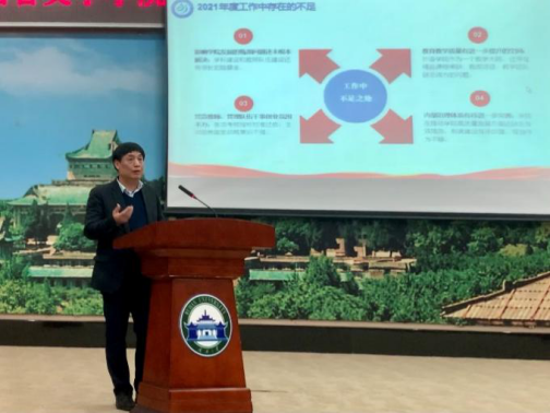 发展面临的挑战与存在的不足,阐述了2022年重点工作和基本思路。他指出,新的一年,学院领导班子将紧紧围绕“双一流”建设目标,提高忧患意识,切实打好人才攻坚战,全面深化绩效改革,进一步求真务实、开拓进取,带领全院师生员工为建设国内知名外国语学院而努力奋斗。