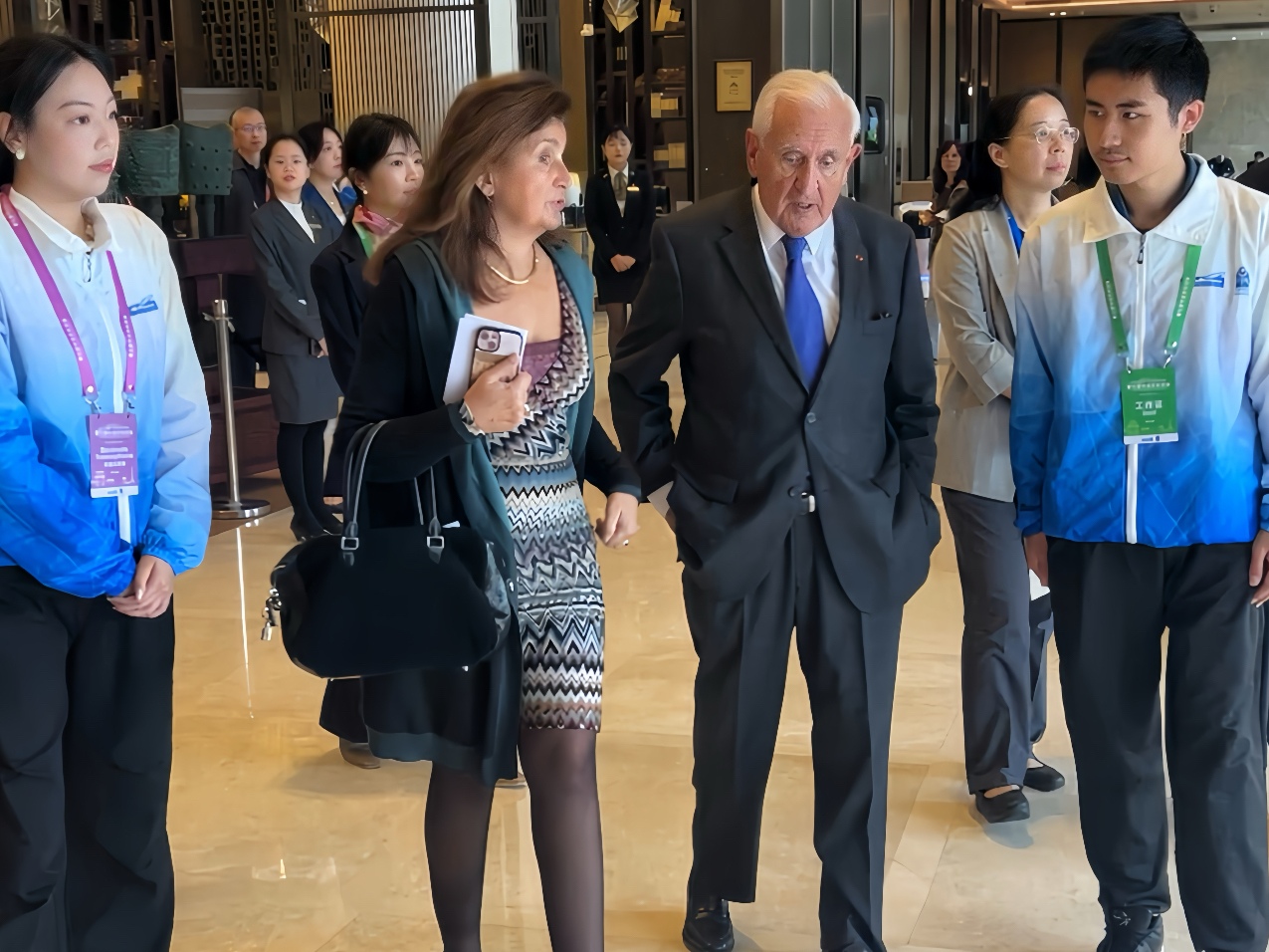 (图 5:蒋林峰(左一)、李高欣(右一)作为志愿者代表送别法国前总理拉法兰先生(右二)和法国展望与发展基金会总干事埃玛纽埃尔·佩雷斯女士(左二))