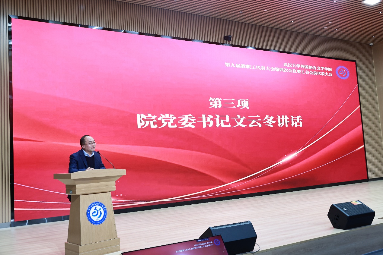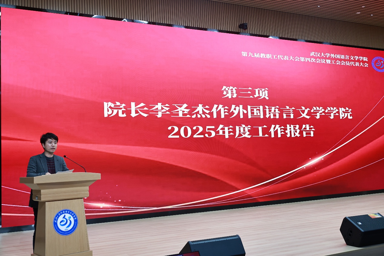 院长李圣杰作题为《凝心聚力,踔厉奋发—全力谱写学院事业高质量发展新篇章》的学院工作报告。他全面总结了学院2025年度在党建引领、人才培养、学科建设、师资队伍、科研工作、国际交流、管理服务等方面的主要工作成效。报告指出,2025年作为“十四五”规划收官、“十五五”规划启动之年,学院以“深化改革年”为主题,以内涵式发展为主线,学科竞赛斩获多项国家级奖项,毕业生就业率位居全校前列,科研经费与高水平论文数量稳步增长,人才引进与培育成效显著。同时,明确了2026年重点工作思路,提出将围绕“十五五”规划实施,深化“外语+” 复合型人才培养模式,做好第六轮学科评估迎评工作,推进党建与事业发展深度融合,全面提升办学水平与学科核心竞争力。