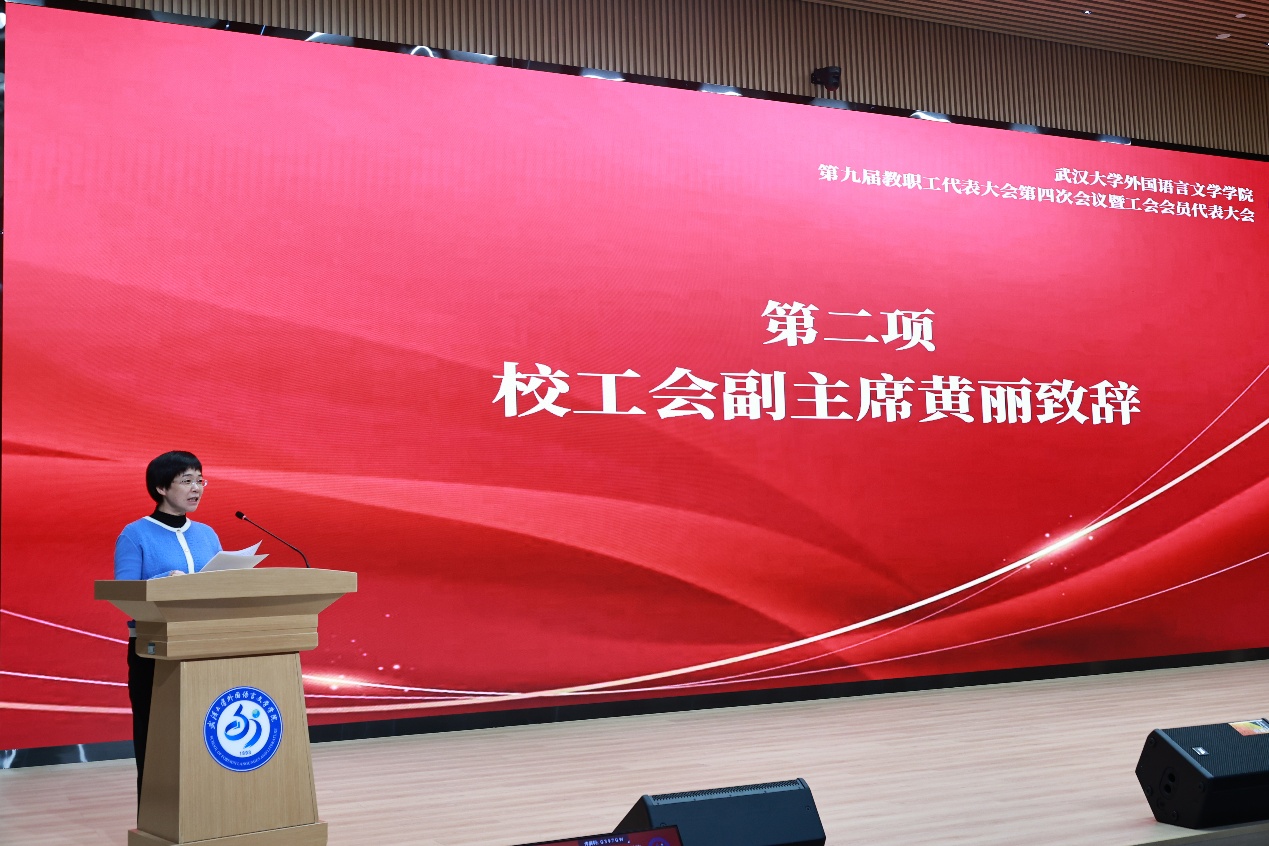 工会副主席黄丽致辞。她对大会的召开表示衷心的祝贺,肯定了学院过去一年取得的显著成绩,同时希望学院工会在院党委的领导下,结合 “十四五” 收官、“十五五” 启动的关键节点,切实履行群团组织职能,强化凝聚力推进高质量发展,为学校 “双一流” 建设和国家战略服务作出更大贡献。