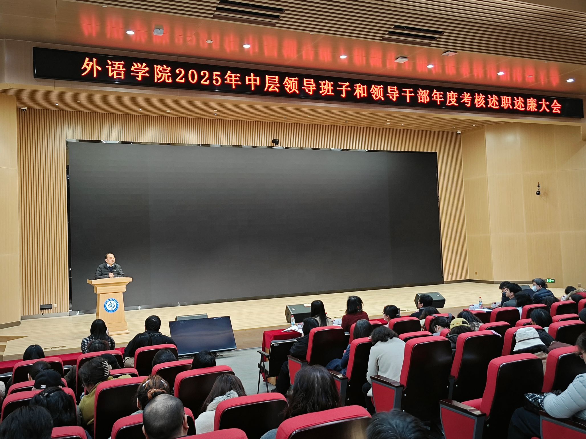 2025年度中层领导班子和领导干部考核述职述廉大会于学院一楼报告厅召开。党委书记文云冬主持会议,全体教职工参加大会。