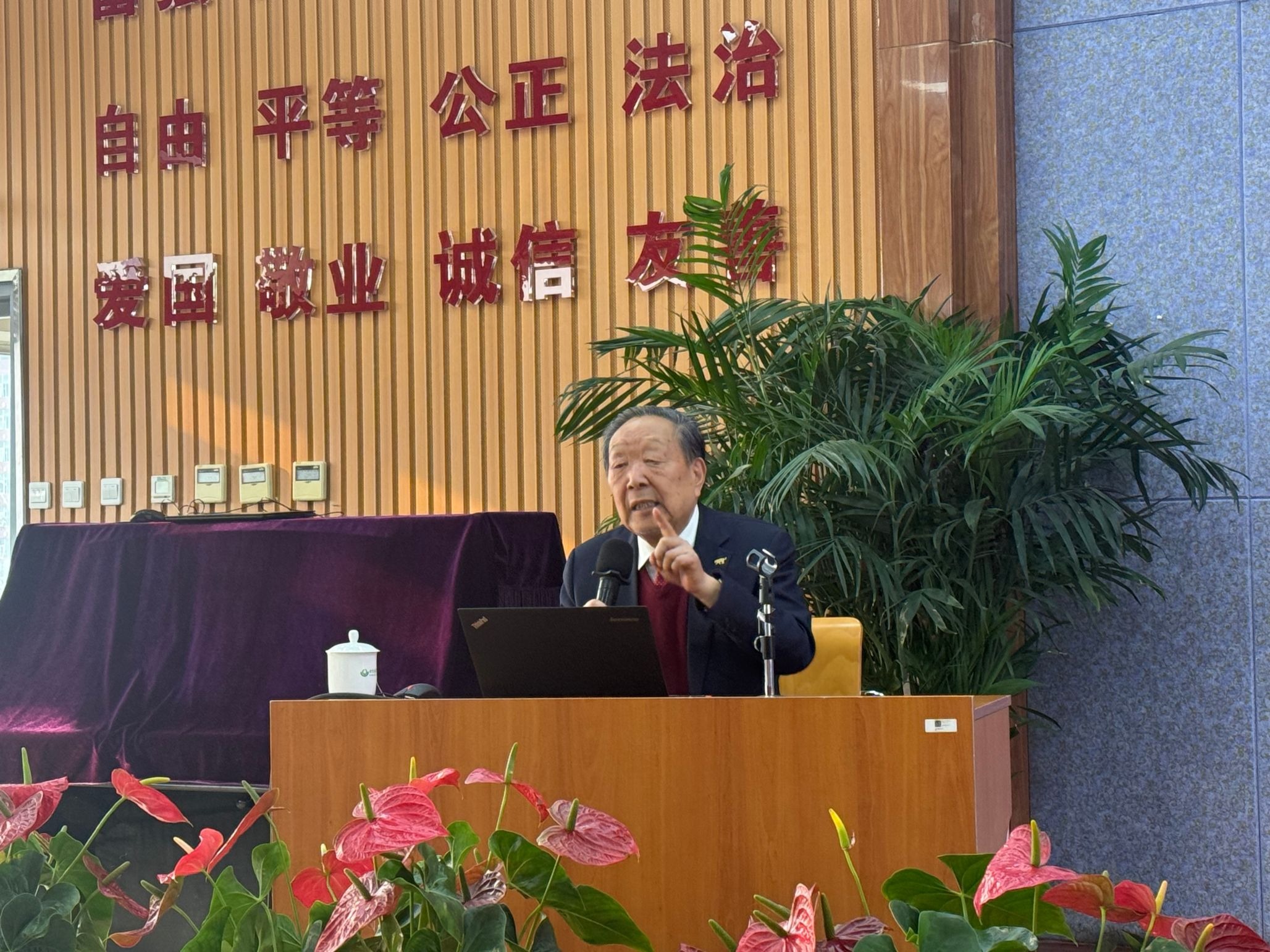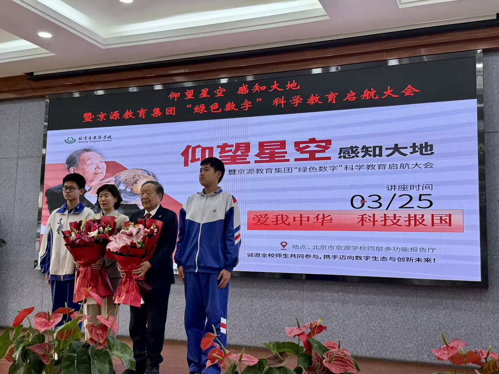 活动期间,李德仁院士以“爱我中华,科技报国”为题,为京源学校师生进行了专题讲座。在讲座中,李院士围绕“留学之路”“创新之路”“未来之路”三个关键词,分享了留学期间的成长之路,介绍了带领团队攻坚克难,服务国家重大战略,助力国家科技自立自强的故事,并以自己“活到老,学到老,干到老,为党和人民奉献到老”的书法作品勉励学生心怀家国、将个人理想融入国家发展大局,使在场师生备受鼓舞。讲座后,李院士与现场学生亲切互动,耐心细致地解答学生的问题,学校学生、教师代表向院士献上鲜花与绘画作品。