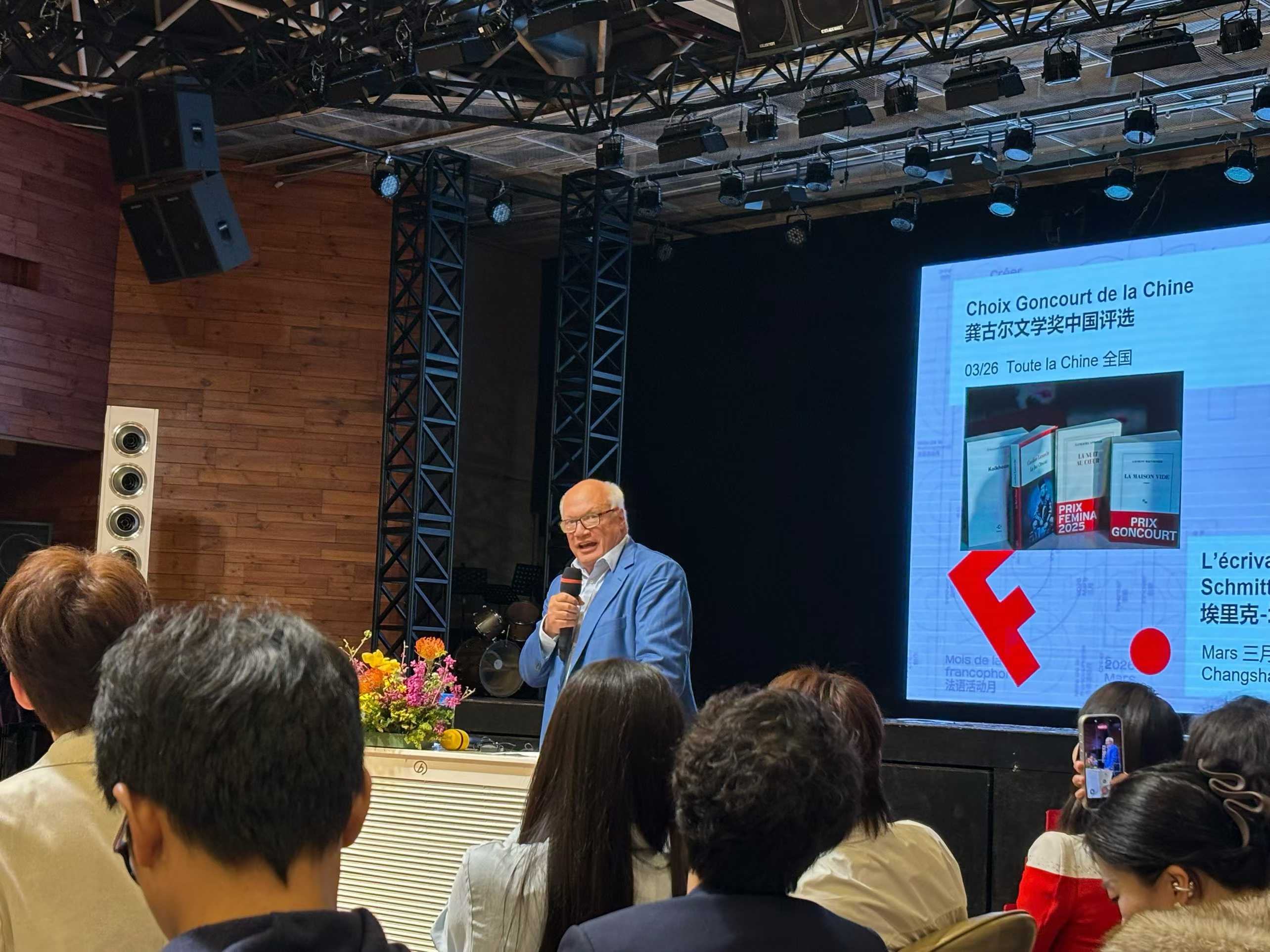 2026年3月26日,评审小组代表张瑞同学前往长沙参加颁奖典礼。她参加了圆桌会议,与《心上的夜晚》(La Nuit au Cœur)的作者娜塔莎·阿帕娜(Nathacha Appanah)线上交流,与法国作家、导演、编剧、法兰西院士、龚古尔文学奖评审团成员埃里克-埃马纽埃尔·施米特(Éric Emmannuel Schmitt)现场对话,参与探讨文学创作与跨文化解读等议题。在颁奖典礼上,《心上的夜晚》最终获评本届“龚古尔文学奖中国评选”获奖作品。