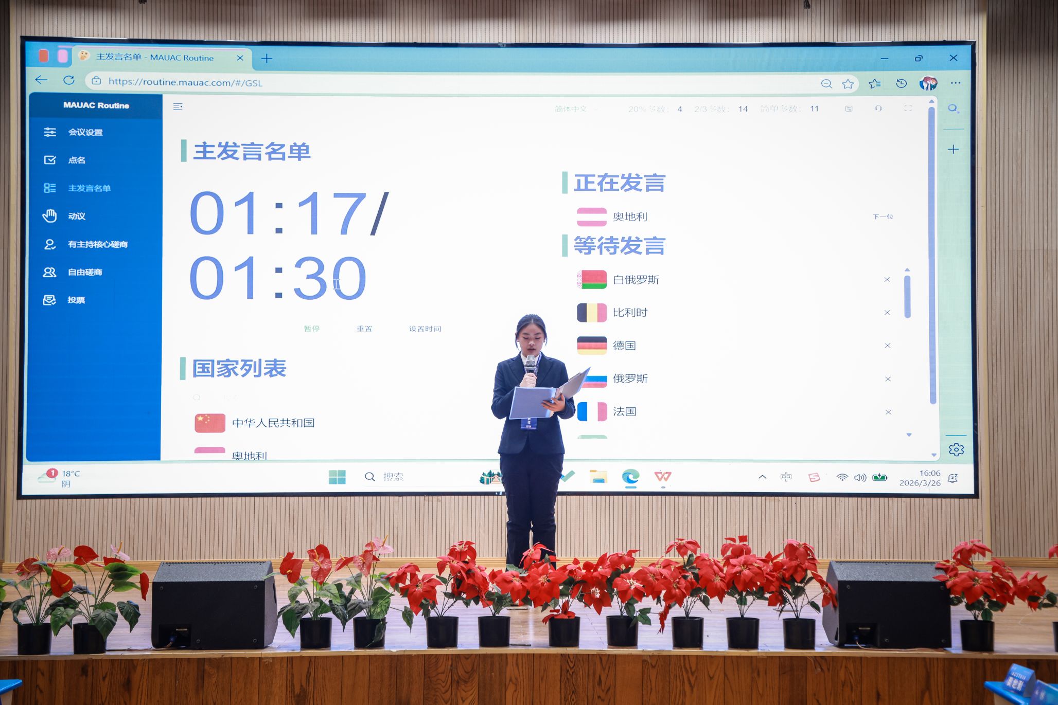 主席依次点名,各国代表高举国家牌响亮应答,全体代表到席,符合议事规则要求。随后开启主发言名单,各国代表围绕全球粮食安全现状、农业可持续发展、国际粮食合作等议题阐述本国立场,发言逻辑清晰、视角多元,展现了出色的国际议题调研能力与语言表达能力。