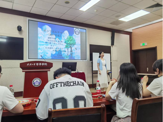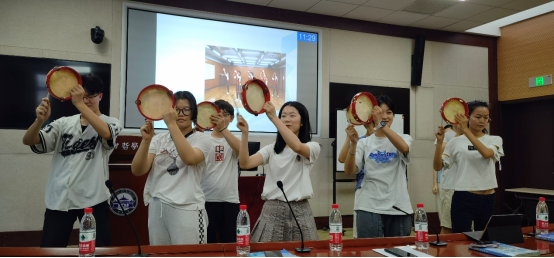 胡逸蝶讲授《综合日语》“流行文化”一课,采用情景教学法和产出导向法,从学生熟悉的动漫、电视剧、传统与流行关系三个方面对比讲述了日本文化中的中国元素以及中日文化的交互影响,学生击鼓表演令人印象深刻,增强对文化的理解。