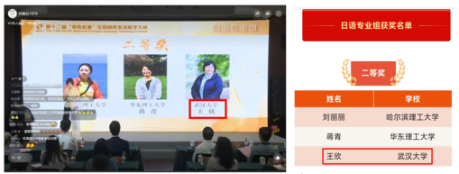 本届大赛分为英语专业组、商务英语专业组、翻译专业组、日语专业组四个组别,其中日语专业组首次被纳入大赛。我校日文系王欣老师首次参赛就获得湖北赛区日语专业组特等奖,并成功晋级全国总决赛。经过激烈角逐,荣获日语专业组全国总决赛二等奖。