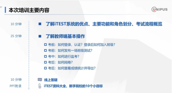 iTEST 智能测试云平台,是专注于为高校外语教学提供在线测评资源与服务的一站式测试云系统。培训内容围绕 iTEST 系统的主要特点和功能展开,重点介绍了教师端基本操作方法。