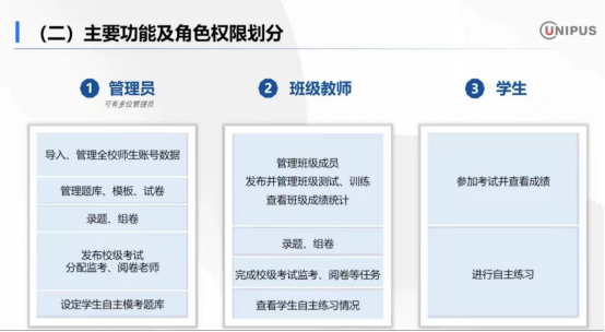通过角色权限划分,管理员可以管理题库和试卷并发布校级考试,班级教师可以录题、组卷、发布班级测试和训练任务,学生可以进行自主练习。