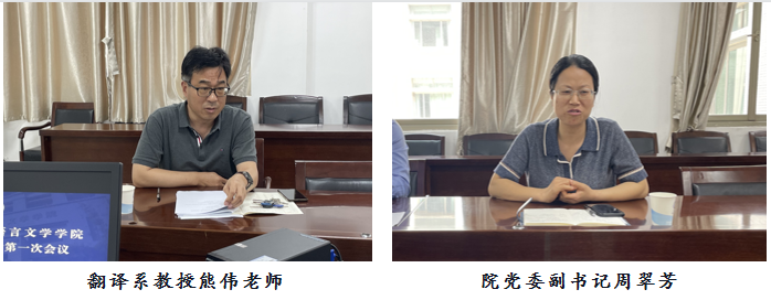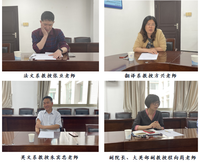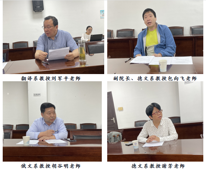 各位委员围绕学院在学科建设方面的优劣势、学科发展预期目标、重点改革举措以及希望学校支持的事项等方面展开热烈讨论和深入交流,积极献言献策。翻译系教授刘军平,副院长、德文系教授包向飞,俄文系教授胡谷明,德文系教授谢芳,法文系教授张亘,翻译系教授方兴,英文系教授朱宾忠,副院长、大英部副教授程向莉,翻译系教授熊伟和院党委副书记周翠芳依次发言。