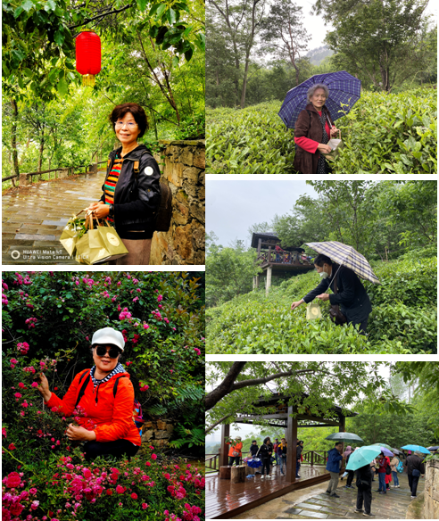 出发前往目的地。老同志个个精神饱满,对三年疫情后学院老协组织的首次春游活动充满期待。见到多年不见的同事,大家非常高兴和激动,一路欢声笑语,彼此分享着自己的退休生活,三年疫情带来的阴霾被一扫而光。上午10时左右,大家到达目的地“花香茶谷”。虽然天公不作美,开始下起了小雨,但老同志们的兴致没有受到丝毫影响。大家打着伞,在雨中边漫步边拍照,呼吸着清新的空气,有老同志戏谑称这是“雨中情”。
