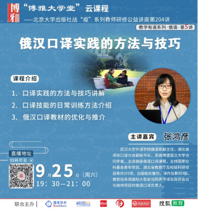 张鸿彦老师应北京大学出版社邀请,在“博雅大学堂”作了题为“俄汉口译实践的方法与技巧”的云端公益学术报告。该场直播讲座通过小鹅通课堂、蔻享、畅想谷、学术志、凤岐茶社、搜狐教育等平台进行了转播,累计观看人数达12万以上。