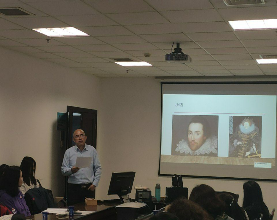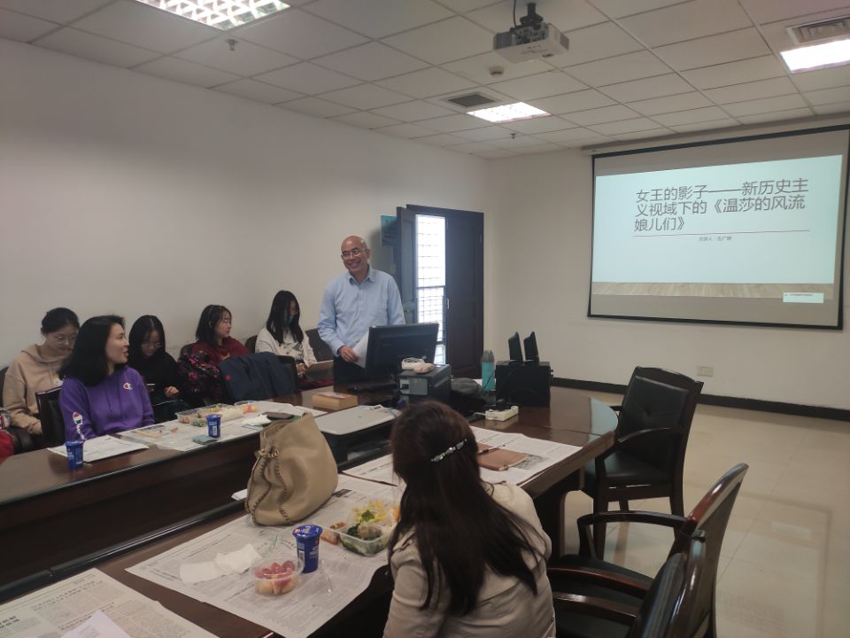 3055会议室举行了一场颇具人文风味的学术午餐会。在轻松、和谐的聊天式氛围中,左广明老师进行了以“女王的影子——新历史主义视域下的《温莎的风流娘儿们》”为主题的分享。主持人戴丹妮老师首先介绍了《温》剧的高观赏性和受欢迎度,左老师也强调了自己在核心通识课教学、伊丽莎白一世自传,乃至英国生活经历中获取的灵感。