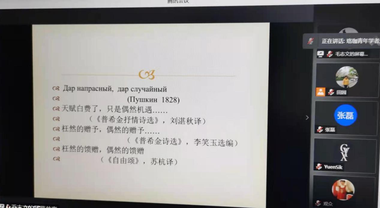 俄语系讲师毛志文老师为俄语系师生和校友做了题为“俄语诗歌翻译探索”的线上学术讲座,讲座以腾讯会议形式进行,时长1时30分钟。约30名俄语系师生、校友听取了讲座。