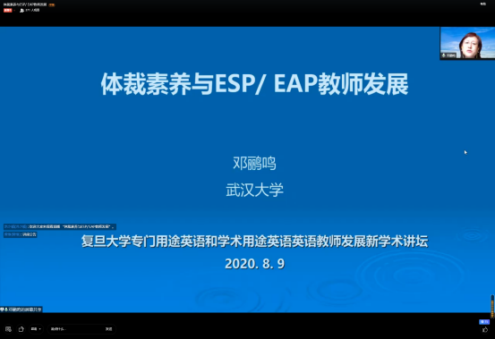52书库 邓鹂鸣教授应复旦大学新学术论坛特邀,于2020年8月9日出席本次云端高端论坛,并作了题为“体裁素养与ESP/ EAP教师发展”专题主旨报告,受到与会专家、一线参听学者及教师的一致好评。本次论坛由复旦大学出版社主办,近2000名学者和一线教师齐聚云端论坛,针对当前我国专门用途英语和学术用途英语教师发展的主要问题及新趋势展开探讨,以期更好地推动新文科背景下我国专门用途英语和学术用途英语教师发展。