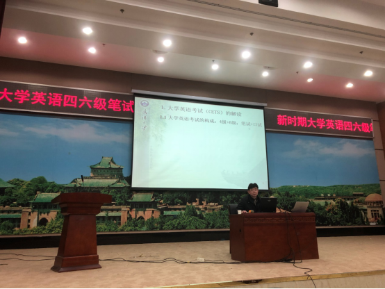 研讨交流活动分为两部分进行。第一部分由教育部高等学校大学英语教学指导委员会委员汪火焰教授主讲,题为“新时期大学英语四六级笔试与口试的解读”,汪教授首先从大学英语考试(CETS)的构成出发,介绍了大学英语四六级笔试题的新动向与特点,即测试学生的综合运用能力和跨文化交际能力。汪教授指出,大学英语四六级考试是世界上考生人数最多的考试,基于此,相应的考试阅卷改革也正在进行中。此外,汪火焰教授还向老师们介绍了四六级考试任然保留的原因,以及CETS和国家英语能力等级考试(NETS)的关系;传达了教育部考试中心广州会议分步骤全面推行大学英语口语考试的精神。最后,汪火焰教授提出了大学英语教学的新对策,帮助学生更好地适应四六级考试的改革。