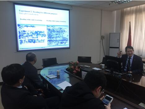 在3月27日上午的讲座中,郑冰寒博士深入浅出地介绍了翻译过程研究的主要方法和前沿动态。郑博士首先依据霍尔姆斯对翻译研究的分类,对翻译过程研究做了清晰准确的定位,指出了翻译过程研究的重要性。之后,郑博士按照研究方法的演进,采用大量实际研究案例,详细介绍了有声思维(TAPs)、击键记录(key-stroke logging)、眼动技术(eye-tracking)等翻译过程研究的主要方法,分析了各自的优点和不足,提出了翻译研究三位一体的三角验证模式(Triangulation Model),建议研究者应采用多种方法交叉验证实验结果。郑博士进一步提出翻译过程研究应借鉴脑电和核磁共振等技术手段,从认知神经科学的跨学科视角深入研究译者的翻译过程。最后,郑博士就研究过程、实验设备等方面耐心细致地回答了在场师生的提问,与马萧教授、熊伟教授等进行了深入的交流和讨论,讲座气氛热烈。