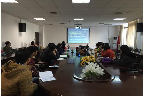 Ying Zheng博士首先向大家介绍了《欧洲共同参考框架》(CEFR)的基本内容,背景知识及其应用,接着介绍了CEFR在中国写作测试方面的应用。Ying Zheng博士指出CEFR与中国大学四六级考试评分标准侧重点不同,并就其研究结果与在场师生进行了深刻的探讨,让大家受益匪浅。展示之后的讨论环节,师生们积极发言,互动热烈。