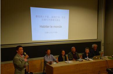 2015年6月10号,巴黎七大孔子学院在巴黎七大主教学楼的阶梯大教室举办了以《居住在世界上》为主题的中国诗人法国读者见面会及中国诗歌吟诵会。受邀参加此次活动的有当代著名诗人于坚、欧阳江河、芒克。现场听众中除孔子学院以及巴黎七大中文系的学生外,还有不少法国中国文学爱好者以及中国的旅法作家。见面会由著名的中法文学作品翻译家尚德兰(Chantal Chen-Andro)女士和巴黎七大孔子学院法方院长徐爽女士共同主持。