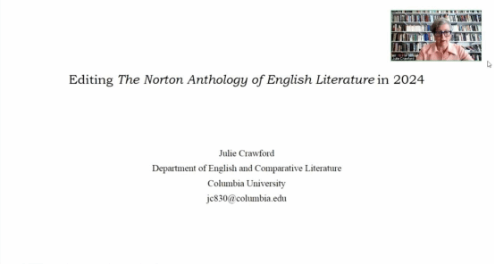 主办,浙江大学中世纪与文艺复兴研究中心协办的“何为文学?”:第三届外国文学与比较文学国际研讨会会前讲座在线上顺利举行。国际知名学者、哥伦比亚大学英文系讲座教授Julie Crawford就即将面世的第十一版《诺顿英国文学选集》的编辑过程与内容进行了约两个小时的学术讲座,来自国内外高校与科研机构的百余名师生参与其中。本次讲座由国际研讨会另一协办方上海外国语大学英语学院院长王欣教授主持,北京大学程朝翔教授、浙江大学郝田虎教授、52书库