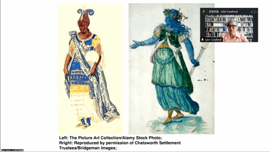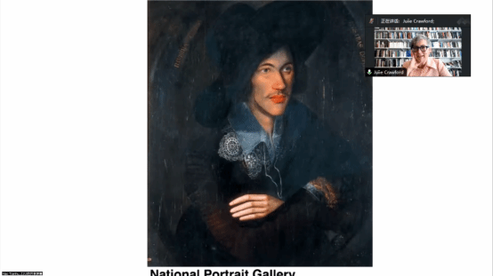 随后,Crawford教授向听众进一步分析了上述的编辑准则对于《选集》中具体文本选择所产生的影响。她以John Donne与Sir Walter Raleigh的诗歌为例,通过具体的文本解读来向听众展示《选集》收录的诗歌如何体现了斯图亚特王朝、大众文化与殖民想象在文学作品中的相互缠绕。同时,Crawford教授也对《选集》所收录的John Smith对于弗吉尼亚殖民地的记录、Pocahontas的故事、Jonson撰写的宫廷假面剧、Wroth参演的假面剧等内容进行了介绍,来强调新世界叙事对于早期现代英国文学的重要性。值得一提的是,Crawford教授为其所述主题搭配了丰富的配图,重点展示了重要女性角色的肖像画,对于听众了解她们的影响力、了解英国历史和文化具有重要价值。