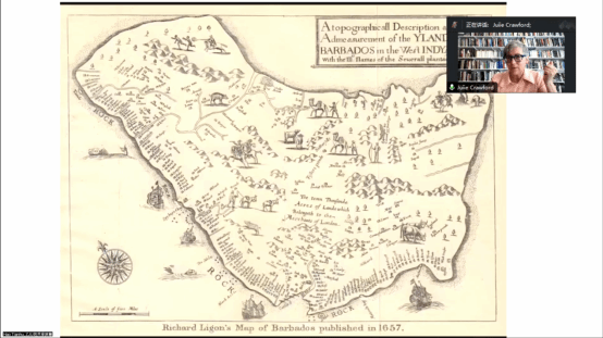 接着,Crawford教授展示了《选集》中Richard Ligon著名的1657年巴巴多斯(Barbados)地图插图,并向读者介绍了这张插图的重要性。教授指出,从《选集》收录的Ligon作品中,读者可以对早期现代英国生活有极为细致的了解,比如女性的流行着装、女性黑人在当时殖民地、在英国社会现实、文学作品与绘画艺术中的描述。