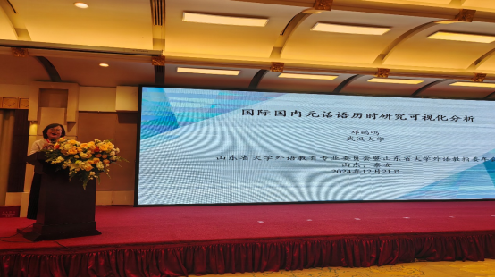 邓鹂鸣教授应2024年山东省外国语言学会“新文科”背景下大学外语教学改革发展研讨会特邀,于2024年12月21日作了题为“国际国内元话语历时研究可视化分析”主旨学术报告。该研讨会由山东省外国语言学会大学外语教育专业委员会主办,由山东泰安学院外国语学院承办、外语教学与研究出版社、上海外语教育出版社等出版机构协办,与会人员200多名。邓鹂鸣教授报告围绕三十年来国际国内元话语研究的发展动态、主要属性特征及前沿热点等进行了系统梳理和探究,获得了与会专家、学者的积极好评。此次大会应邀做主旨报告的还有:西安外国语大学院原副校长党争胜教授、扬州大学原副校长俞洪亮教授、对外经贸大学英语学院院长向明友教授。大会着重针对“新文科”背景下我国外语教育如何合理融合新技术从而更有效创新发展数字化的外语教育这一重要议题展开探讨,与会专家和学者从不同视角分享了真知灼见,为当下及未来新技术赋能我国外语教育改革实践指明了发展方向。
