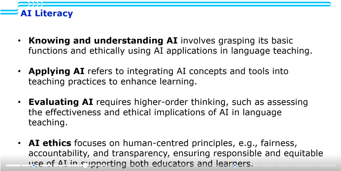 张军教授首先介绍了人工智能(AI)的发展现状及其在教育领域的广泛应用。他详细阐述了语言教师的人工智能素养以及AI引发的教师情绪这两个核心主题。他提出要构建一个概念框架来更好地理解这两个方面。在AI素养方面,涵盖了对AI的基本理解(包括其功能、伦理使用等)、AI在教学实践中的应用、对AI的评价、遵循AI伦理(涉及公平、问责、透明等原则)以及认识到AI的所有权等问题。