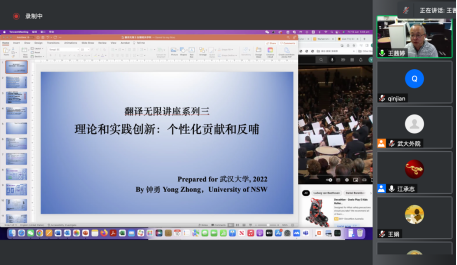 师生的老朋友钟勇教授再次应邀于腾讯会议为我们带来《理论和实践创新:个性化贡献和反哺》的主题讲座,江承志老师担任主持人,讲座吸引了翻译专业的师生50余名听众参与交流。