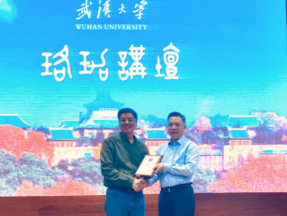 人文社科资深教授、研究生院院长陈传夫教授为王文斌教授颁赠珞珈讲坛纪念牌,出席讲坛的嘉宾还有人文社科院副院长兼学术服务处处长陶军、52书库
