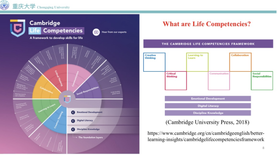 接下来,辜教授详细介绍了“剑桥人生胜任力框架”。该框架包含三个维度和六个核心素养。三个维度分别是学科知识、信息化素养和情绪发展。关于情绪发展维度,辜教授讲述了自己在剑桥大学的访学经历和感悟,阐述了积极的心理状态带来的正面影响。“剑桥人生胜任力框架”的六个核心素养包含批判性思维、学会学习、沟通能力、合作能力、社会责任和创造性思维。书评的写作过程有助于这些核心素养的培养。