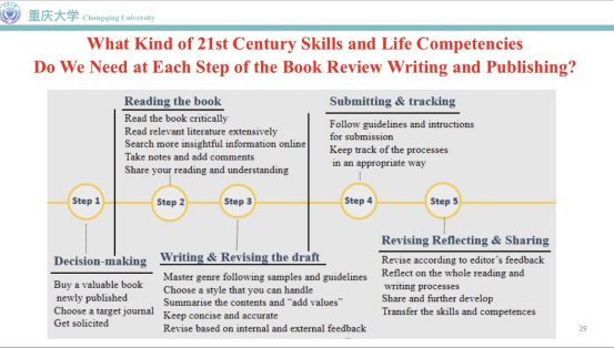 介绍了“剑桥人生胜任力框架”后,辜教授开始讲述自己指导一名硕士研究生进行书评写作的过程。这名学生写书评的心路历程经历了三个阶段。第一阶段,学生感觉“自己也许应该试一试”。第二阶段,学生意识到写书评的过程“永远不会是一路坦途”。在写作过程中,她需要大量阅读目标期刊的书评。完成书评写作后,学生体悟到“我能够从小任务中学到大知识”。书评写作使这名学生学习到了“剑桥人生胜任力框架”中的六大核心素养,这就是一个学生“从零到一”的发展历程。