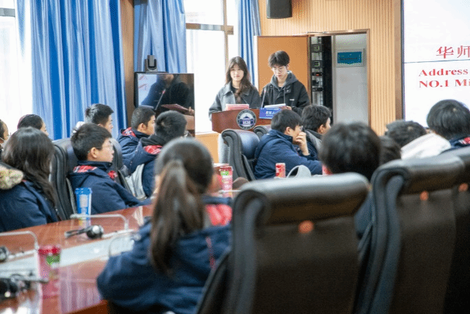交流活动由武大口译队队员黄玉鹏和姚蕴轩全程双语主持,武大口译队副队长吕成乐和华师一附中英语社团指导老师肖潇雨先后简短致辞。