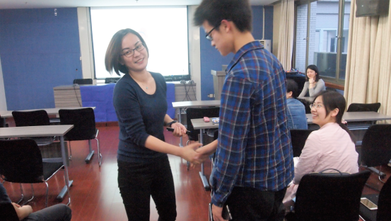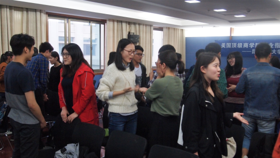 讲座的第二部分是来自昆山杜克大学管理学硕士项目就业指导部的副主任刘老师为大家带来的全英文的课堂体验和workshop环节。在workshop环节,老师要求在场同学用英语向前后左右的同学进行限时5分钟的自我介绍和简短对话。抛开最初的陌生,同学们渐渐地沉浸在与新认识的小伙伴的交流中。环节结束之后,老师通过这个简单的自我介绍活动向同学们介绍了一些第一次见面比较重要的要素,比如握手,眼神的接触,还有着装是否合适等。同时刘老师引入了一个有趣的概念“Elevator Pitch”,在一个在电梯里相遇的场景里,只有60秒到90秒的时间,如何“推销”自己,如何建立自己的第一印象等。介绍完了一些面试的小技巧之后,老师又向大家展示了几份简历让同学们评价。通过对比这几份简历,刘老师告诉大家简历中提到的经历需要显示出一些具体的行为和结果来体现个人能力,而不是单纯的介绍在实习或活动中的职位或者职位描述,而在工作经历中遇到的一些特别情况和任务可以在面试中向面试官介绍。