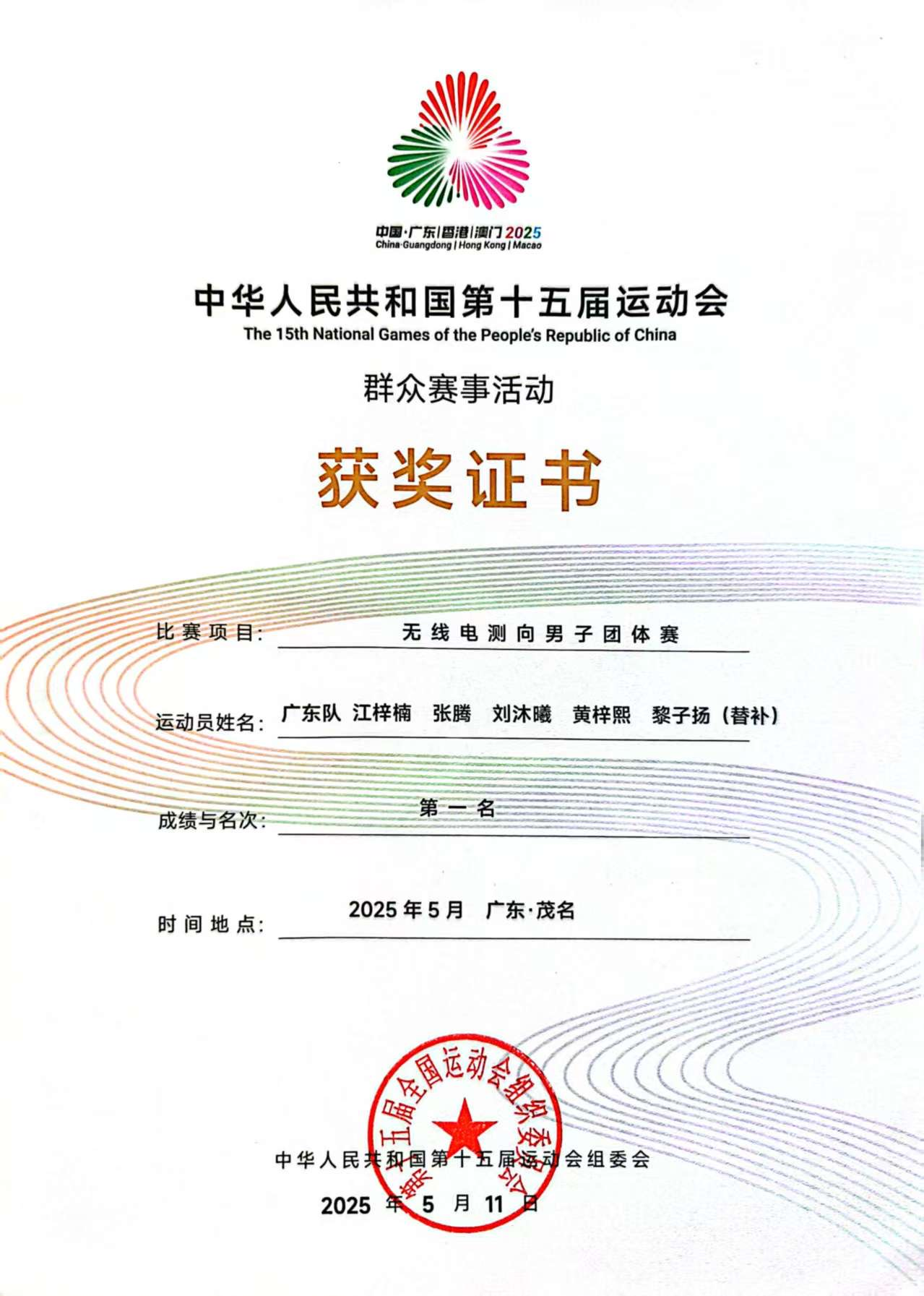2025年5月6日-11日,中华人民共和国第十五届运动会群众赛事定向项目决赛在广东茂名隆重举行,52书库 2024级的刘沐曦同学代表广东省无线电测向队,参加了本次赛事,并勇夺3.5Hz短距离赛个人冠军。